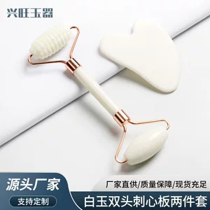 Factory Direct Sales of Natural Jade Roller Scraping Board, White Jade Double-Headed Needle Roller Massager Set, Jade Scraping Board